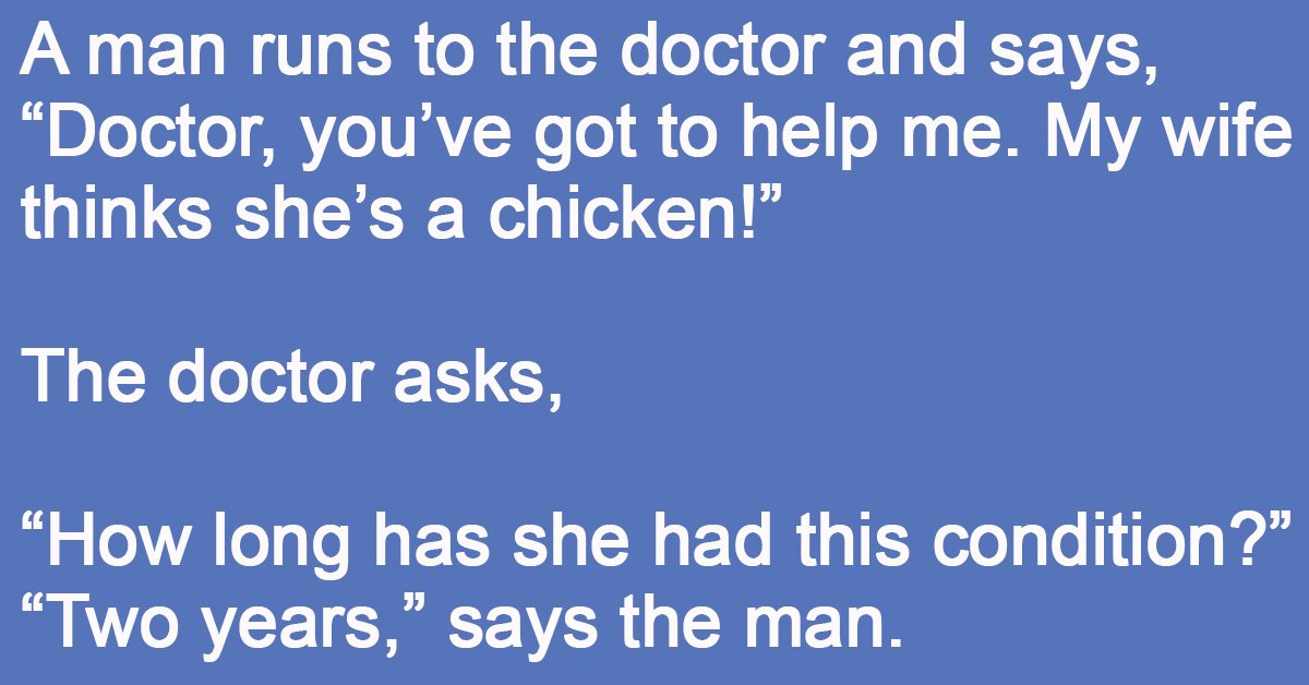 “Doctor, you’ve got to help me. My wife thinks she’s a chicken!”