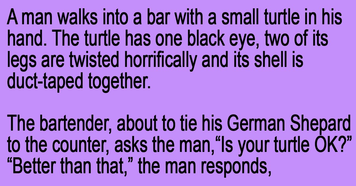 “This turtle is incredibly fast. In fact, go over to the other side of the bar and on the count of three calls over that dog of yours. I bet $50 that my turtle can reach that side of the bar before your dog can.”