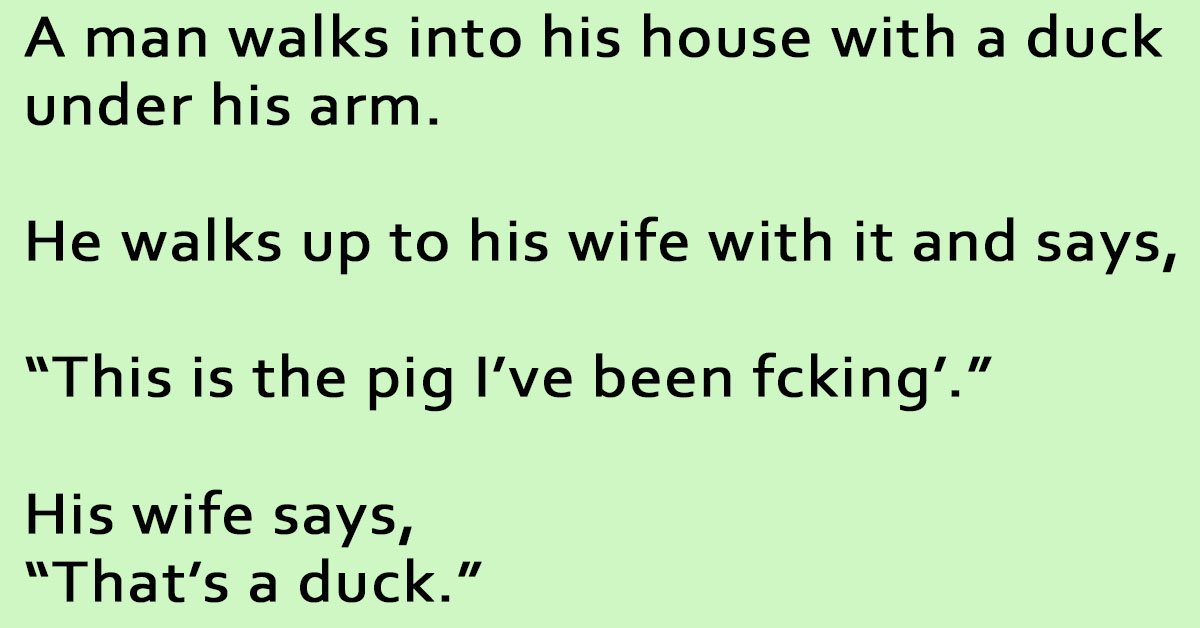 A Man Walks Into His House. March 20, 2023 by Kevin Adams Facebook Twitter Pinterest LinkedInA man walks into his house with a duck under his arm. He walks up to his wife with it and says, “This is the pig I’ve been fcking’.” His wife says, “That’s a duck.” He quickly replies, “I wasn’t talking to you.” Facebook Twitter Pinterest LinkedIn
