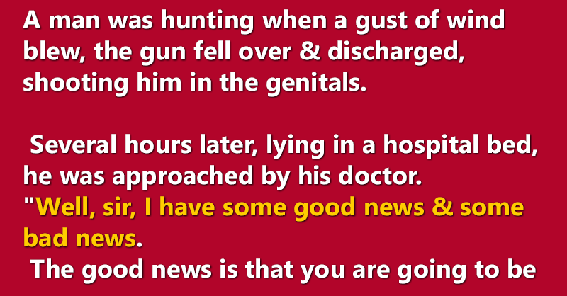 “The bad news is that there was some pretty extensive buckshot damage done to your willy which left quite a few holes in it. I’m going to have to refer you to my sister.”