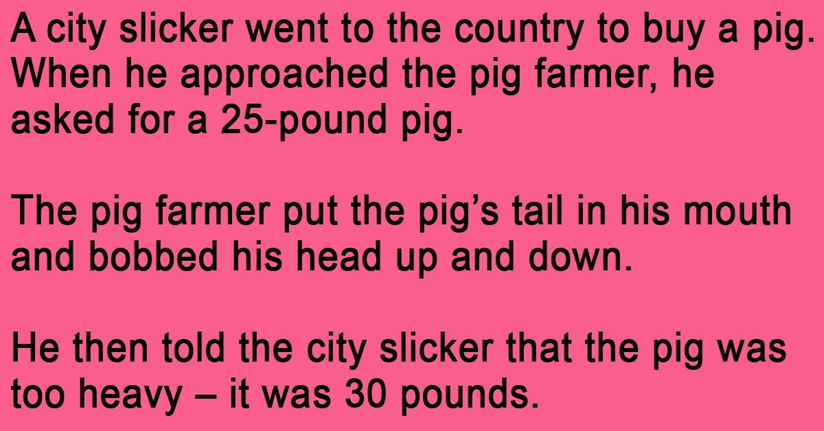The pig farmer put the pig’s tail in his mouth and bobbed his head up and down. He then told the city slicker that the pig was too heavy – it was 30 pounds.
