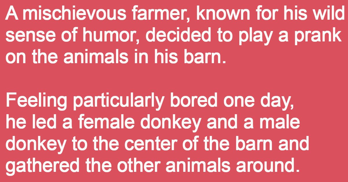 A mischievous farmer, known for his wild sense of humor, decided to play a prank on the animals in his barn.