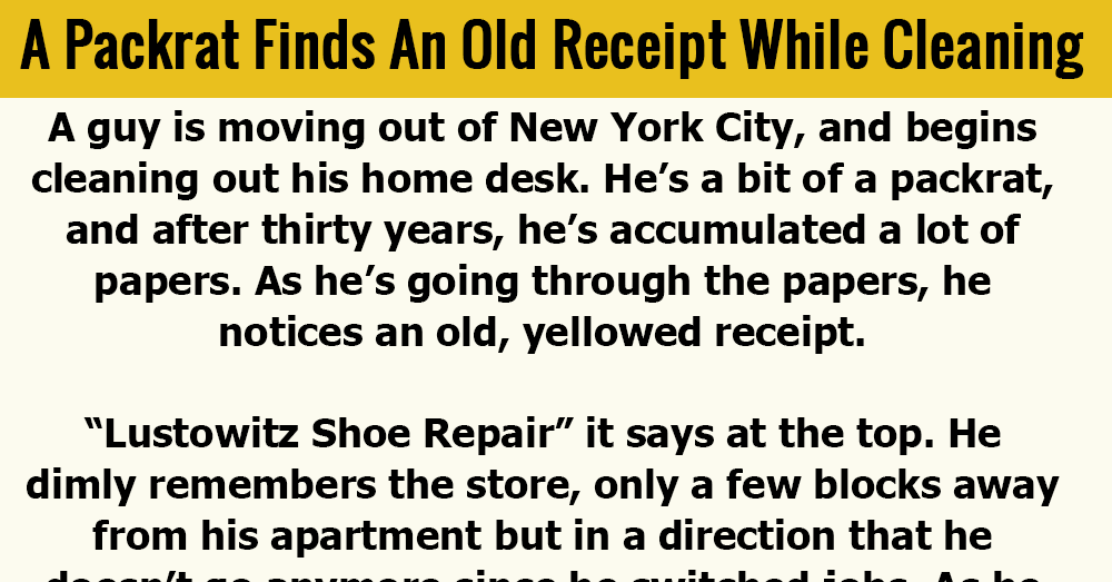 A guy is moving out of New York City, and begins cleaning out his home desk. He’s a bit of a packrat, and after thirty years, he’s accumulated a lot of papers. As he’s going through the papers, he notices an old, yellowed receipt.
