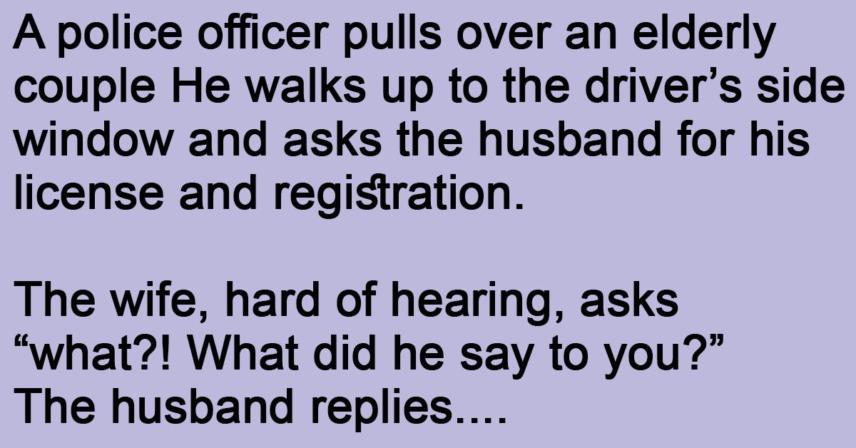 A police officer pulls over an elderly couple He walks up to the driver’s side window and asks the husband for his license and registration.