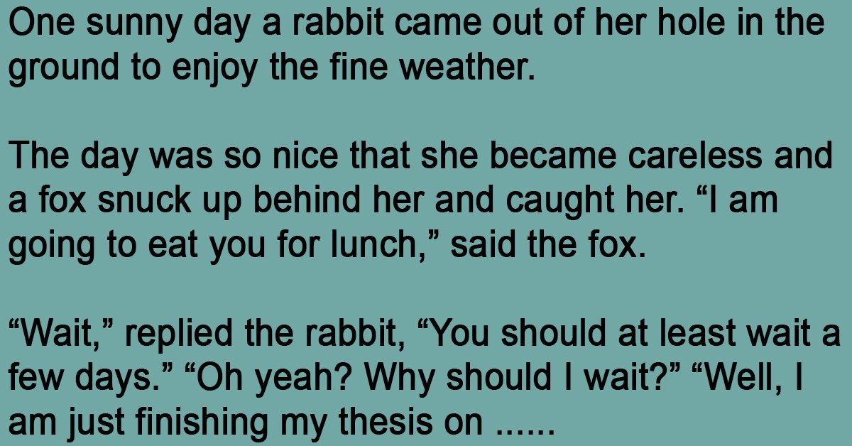 The rabbit finished her thesis and was out celebrating in the local lettuce patch. Another rabbit came along and asked, “What’s up? You seem very happy.”