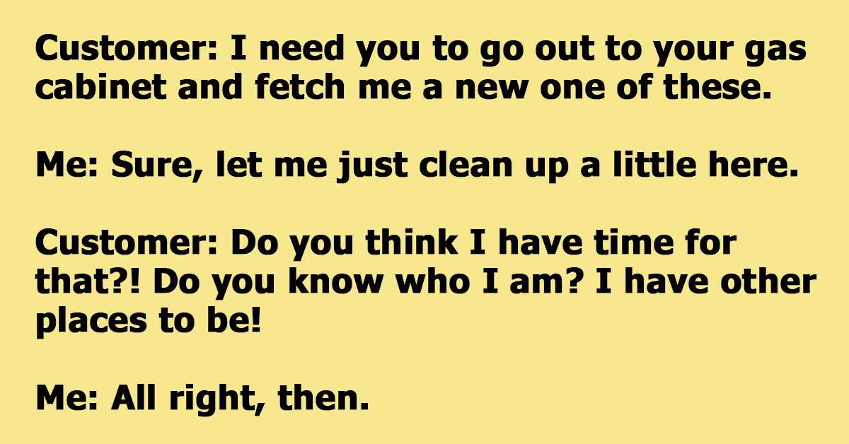 Customer: You teens are so useless these days! All you do is stare at your phones and your computers! Look at you, you can’t even carry a can of gas! You’re all useless! Now hurry up, for f*** sake! I’m going to a very important job interview over at [local entrepreneur, with the owner’s name as a company name]!