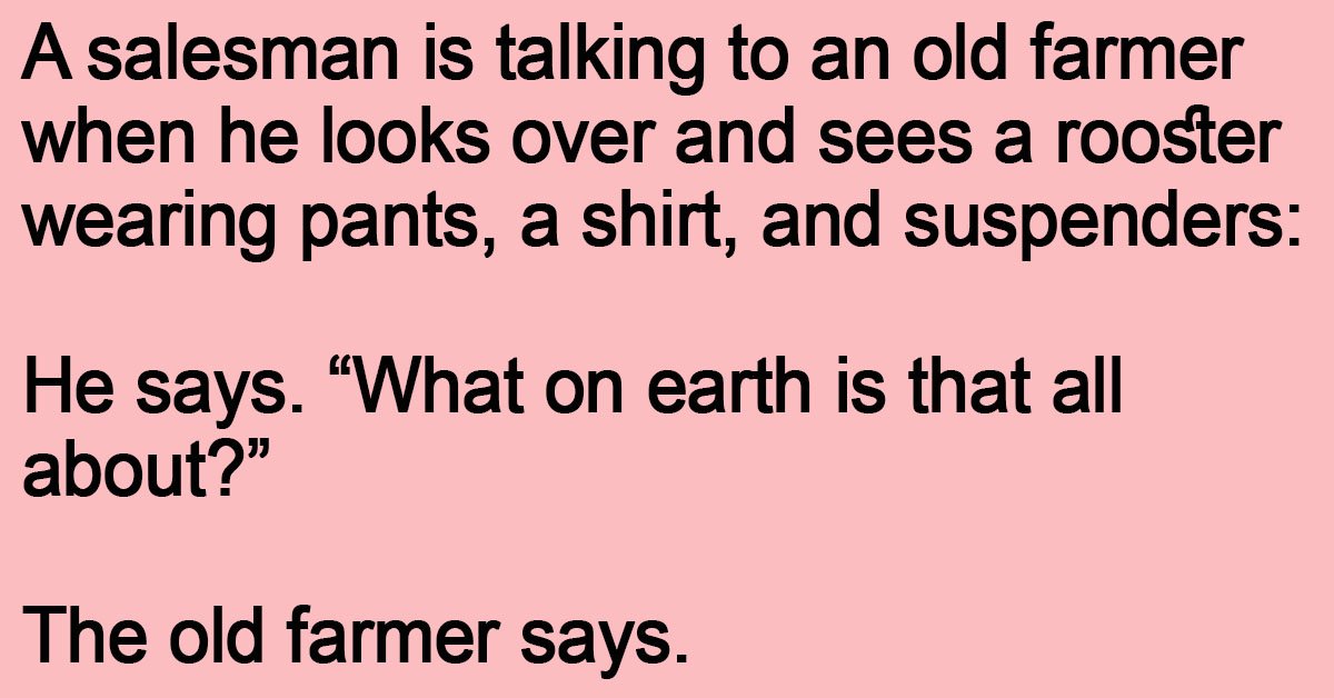 A salesman is talking to an old farmer when he looks over and sees a rooster wearing pants, a shirt, and suspenders:
