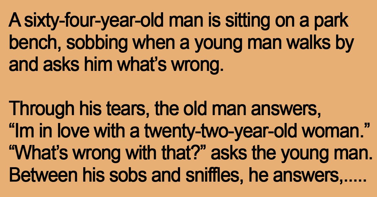 A sixty-four-year-old man is sitting on a park bench, sobbing when a young man walks by and asks him what’s wrong.