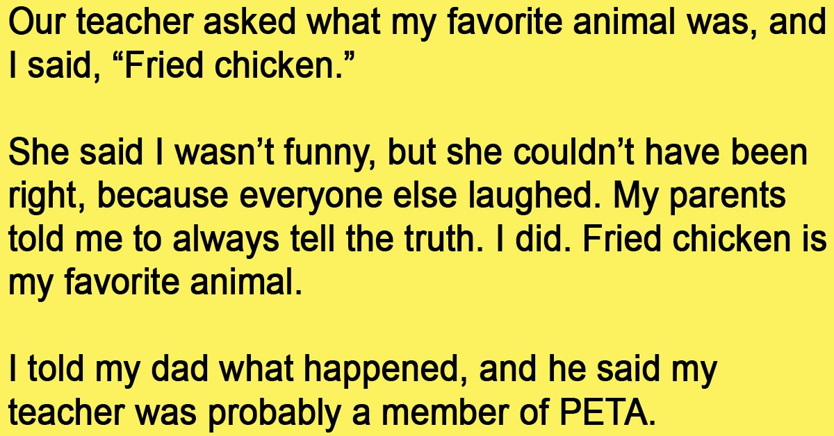 Our teacher asked what my favorite animal was, and I said, “Fried chicken.”