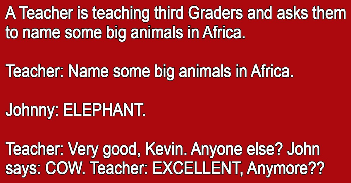 A Teacher is teaching third Graders and asks them to name some big animals in Africa.