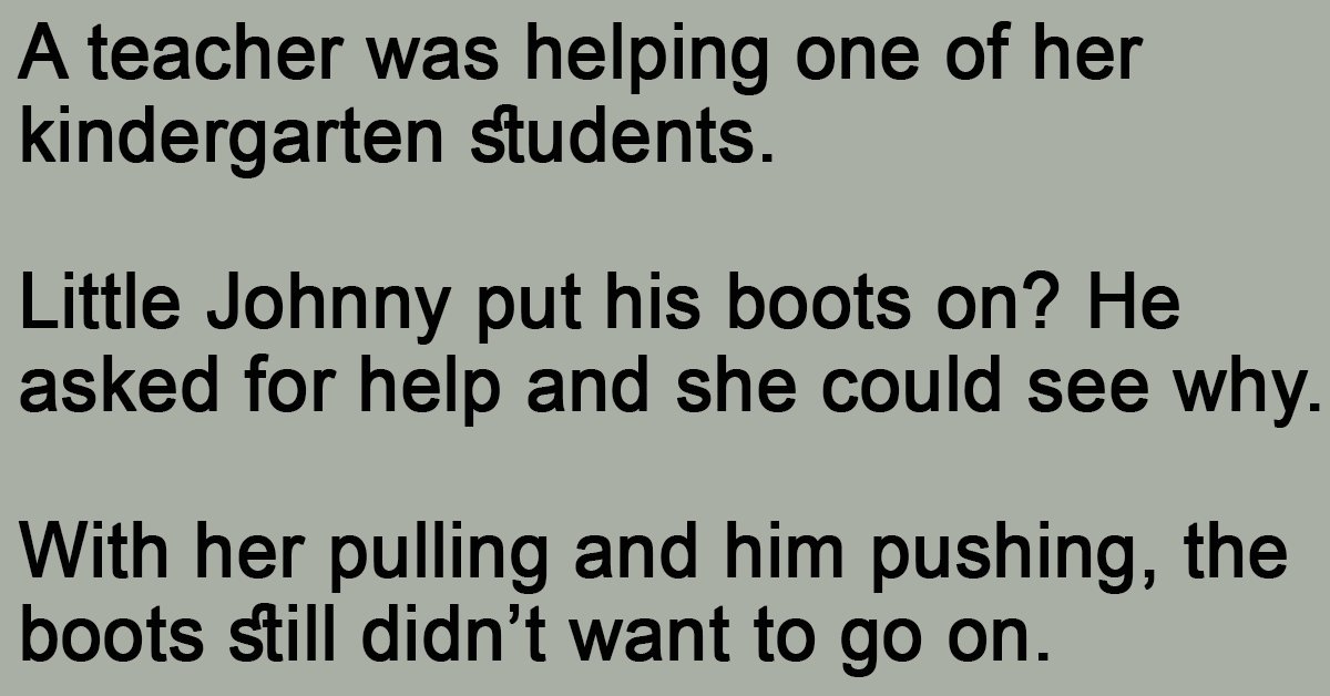 “Why didn’t you say so?” like she wanted to do. Once again she struggled to help him pull the ill-fitting boots off. Little Johnny then said: