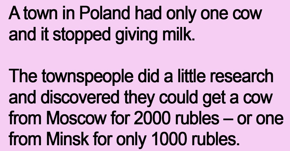 The townspeople did a little research and discovered they could get a cow from Moscow for 2000 rubles – or one from Minsk for only 1000 rubles.
