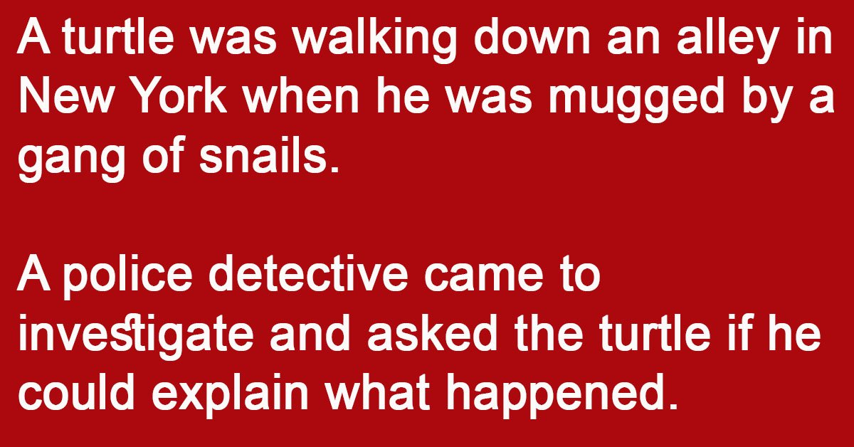 A turtle was walking down an alley in New York when he was mugged by a gang of snails.