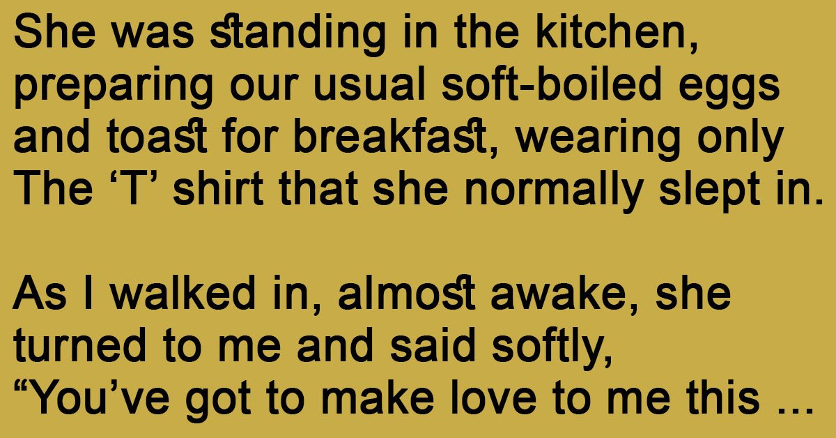 She was standing in the kitchen, preparing our usual soft-boiled eggs and toast for breakfast, wearing only The ‘T’ shirt that she normally slept in.
