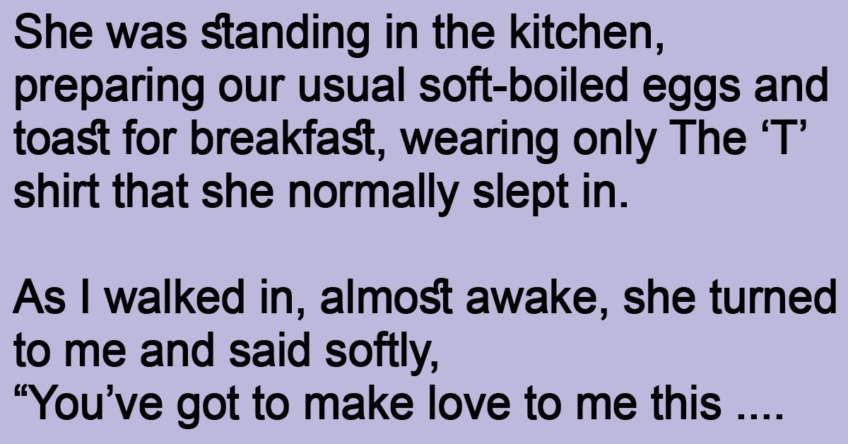 She was standing in the kitchen, preparing our usual soft-boiled eggs and toast for breakfast, wearing only The ‘T’ shirt that she normally slept in.