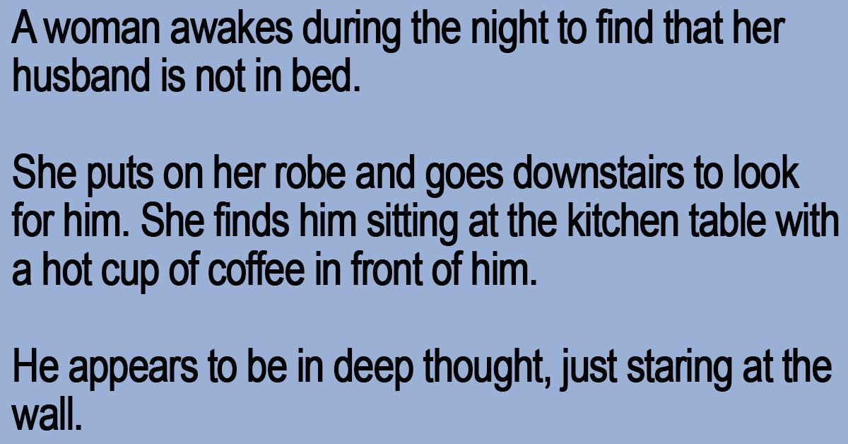 She finds him sitting at the kitchen table with a hot cup of coffee in front of him.
