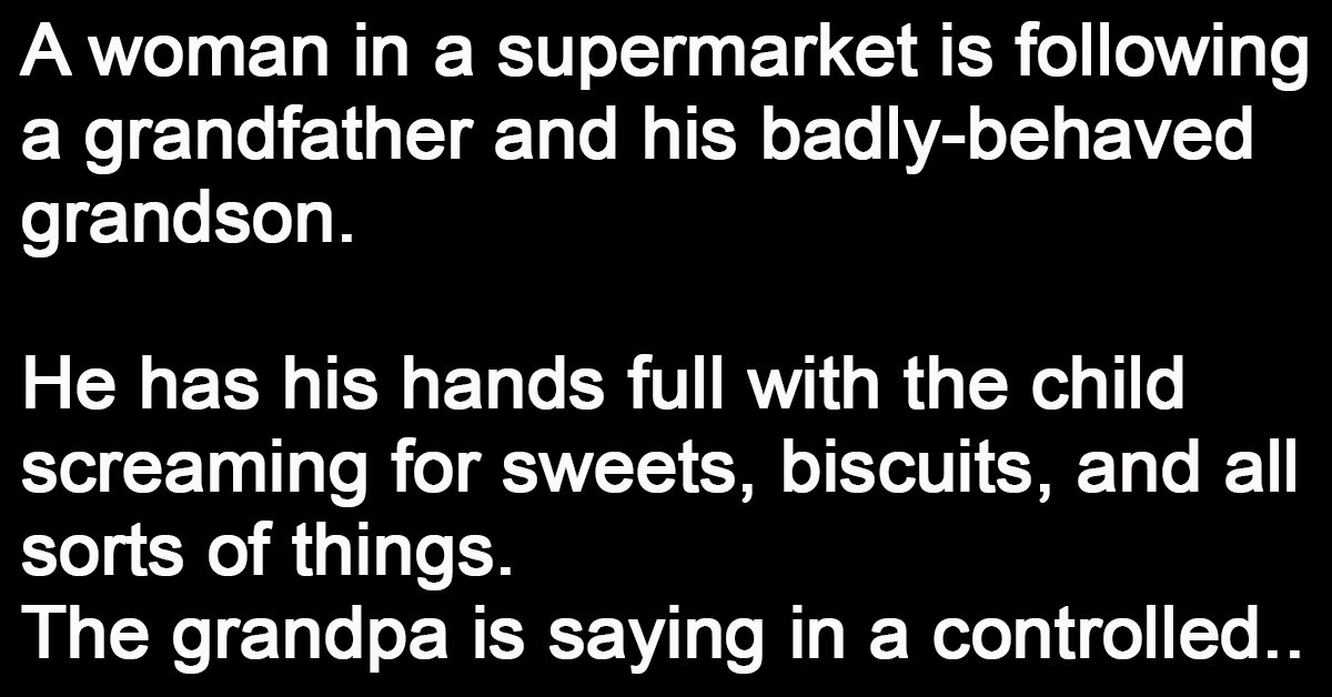 A woman in a supermarket is following a grandfather and his badly-behaved grandson.