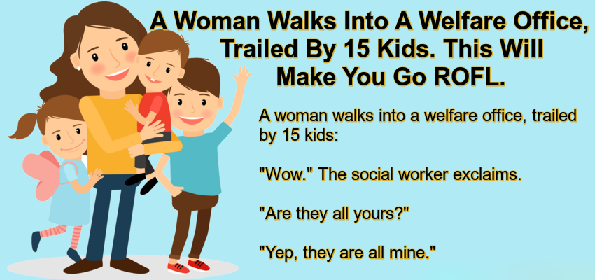 A woman walks into a welfare office, trailed by 15 kids: