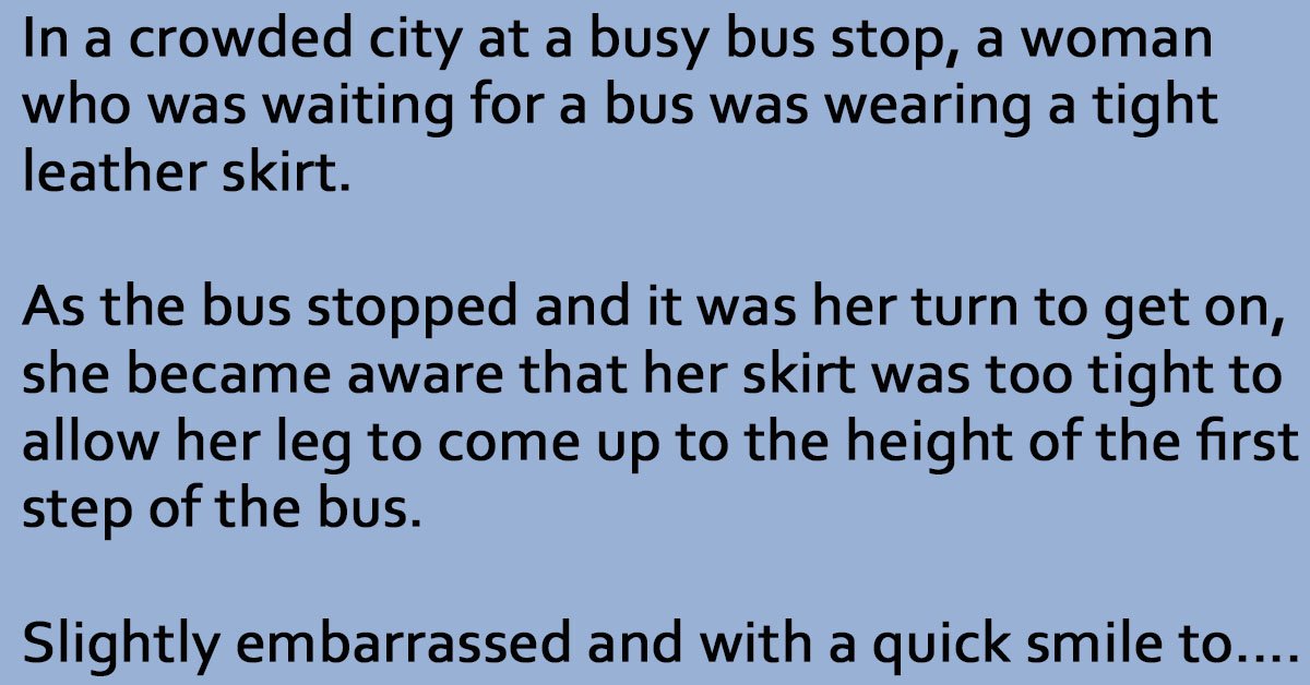 As the bus stopped and it was her turn to get on, she became aware that her skirt was too tight to allow her leg to come up to the height of the first step of the bus.
