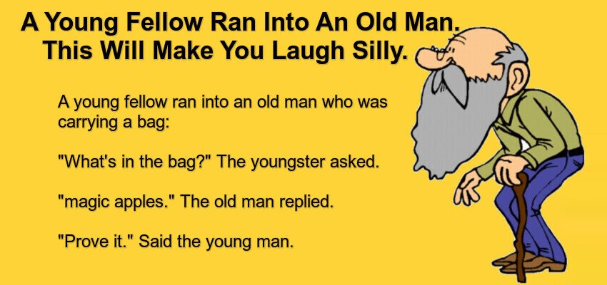 A Young Fellow Ran Into An Old Man. – May 16, 2022 by Kevin Adams Facebook Twitter Pinterest LinkedIn A young fellow ran into an old man who was carrying a bag: “What’s in the bag?” The youngster asked. “magic apples.” The old man replied. “Prove it.” Said the young man. “Well, besides apples, what is your favourite two fruits?” Asked the old man. “Watermelon and peaches.” He answered. The man handed him an apple and told him to try it out. The boy took a bite and said that it tasted like a watermelon. “Ok, turn it over.” He said. The boy did and took another bite and said that it tasted like a peach. The youngster still wasn’t convinced that they were magic. The old fellow told him to name something else that he liked to eat. “I like to eat p*ssy.” He snapped. The man handed him another apple and told him to try it. He took a big bite, spat it out, wiped his mouth and exclaimed. “That tasted like sh*t”. The old man looked at him, smiled and said. “Turn it over.” Facebook Twitter Pinterest LinkedIn