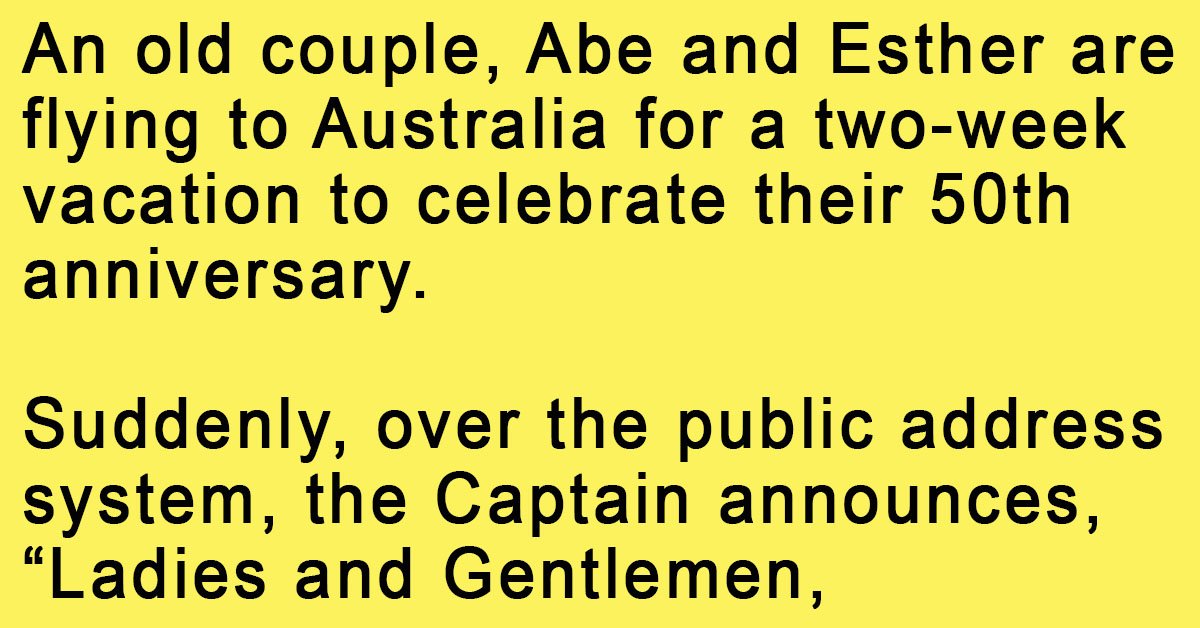An old couple, Abe and Esther are flying to Australia for a two-week vacation to celebrate their 50th anniversary.