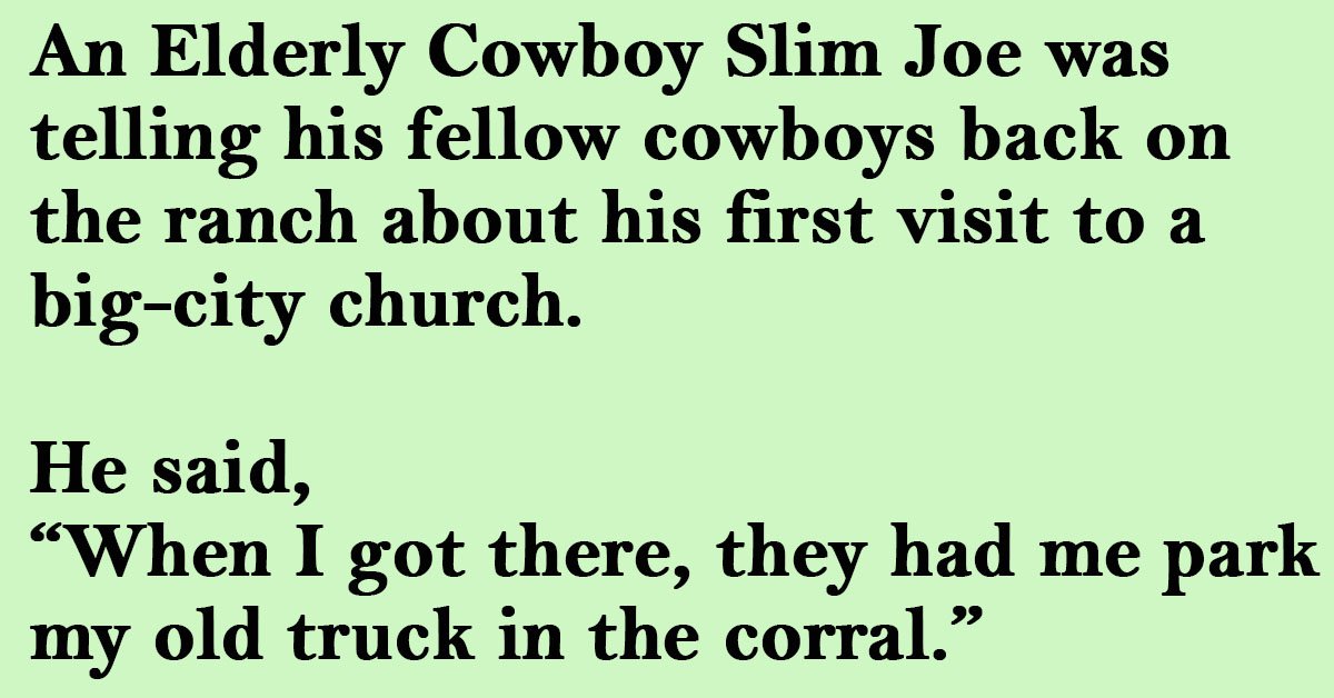 An Elderly Cowboy Slim Joe was telling his fellow cowboys back on the ranch about his first visit to a big-city church.