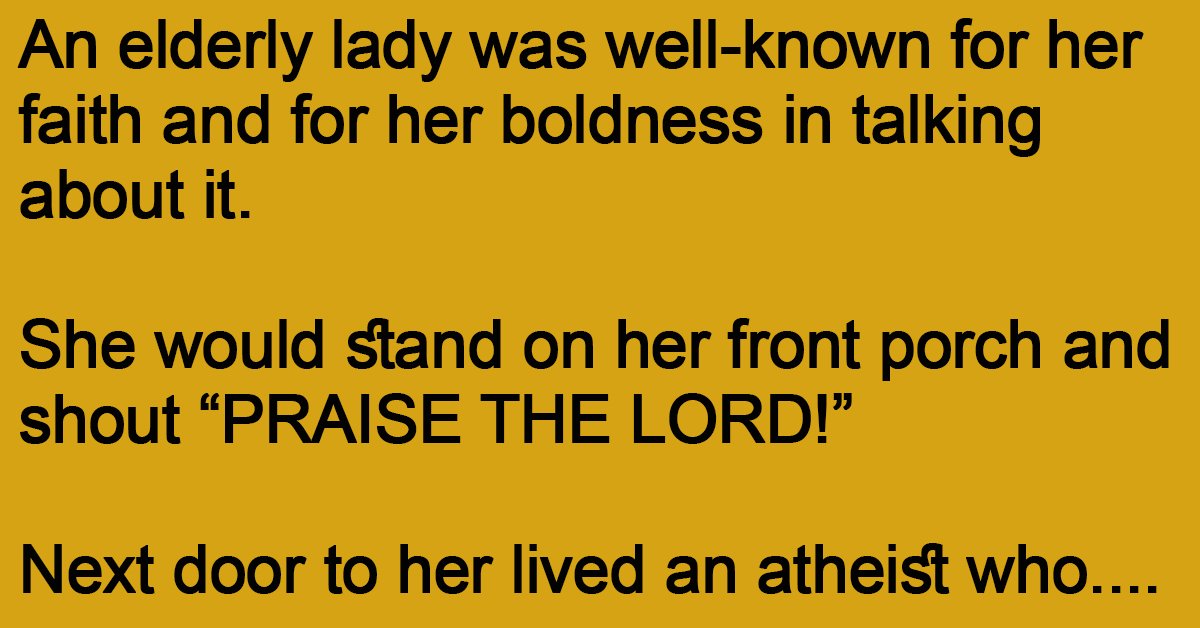 Next door to her lived an atheist who would get so angry at her proclamations he would shout,
