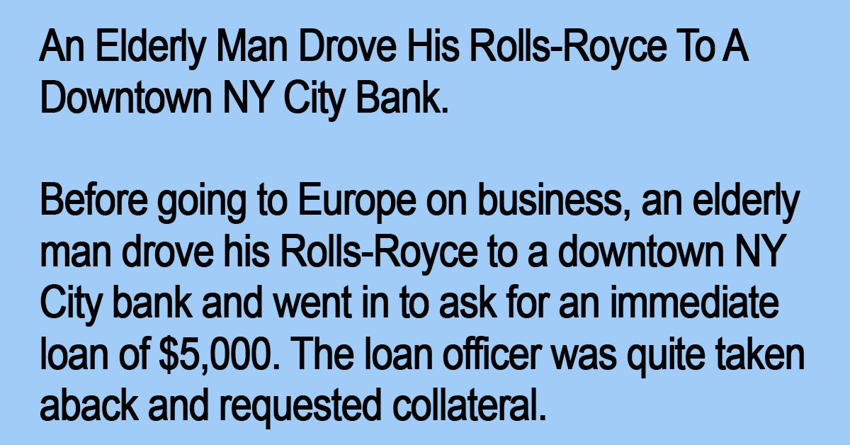 Before going to Europe on business, an elderly man drove his Rolls-Royce to a downtown NY City bank and went in to ask for an immediate loan of $5,000.