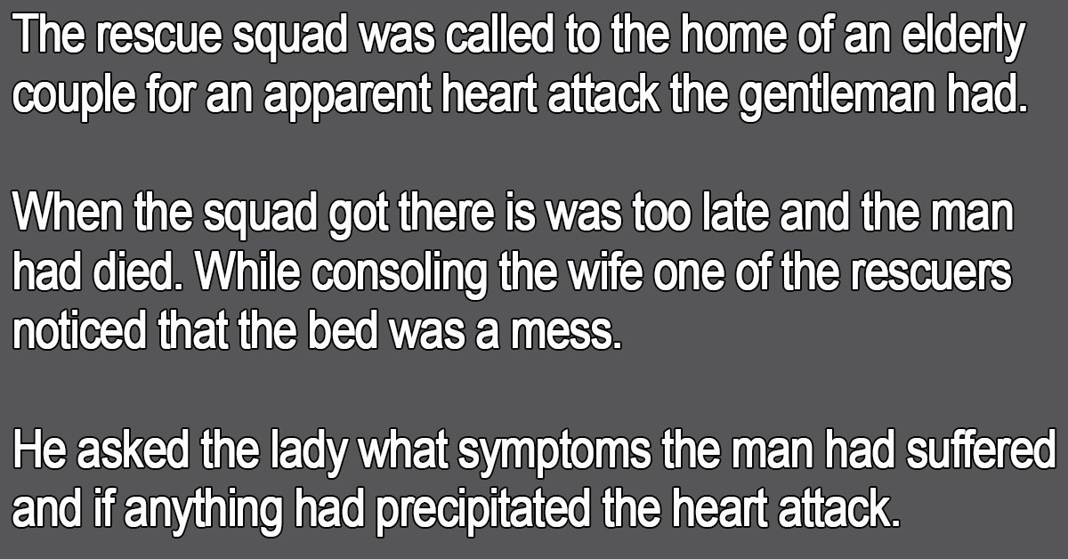 “Well, we were in the bed making love and he started moaning, groaning, thrashing about the bed, panting, and sweating. I thought he was coming, but I guess he was going.”