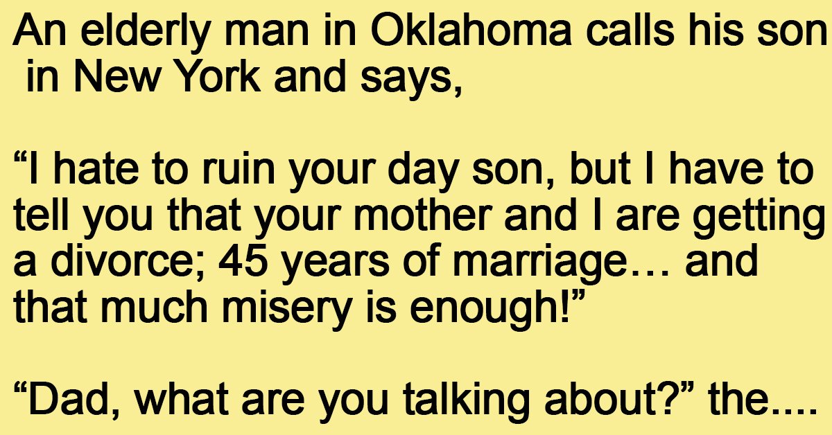 “I hate to ruin your day son, but I have to tell you that your mother and I are getting a divorce; 45 years of marriage… and that much misery is enough!”