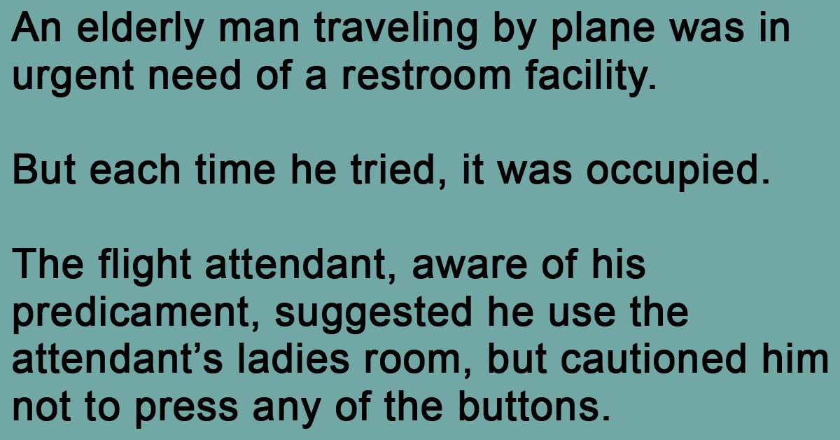 The flight attendant, aware of his predicament, suggested he use the attendant’s ladies room, but cautioned him not to press any of the buttons.