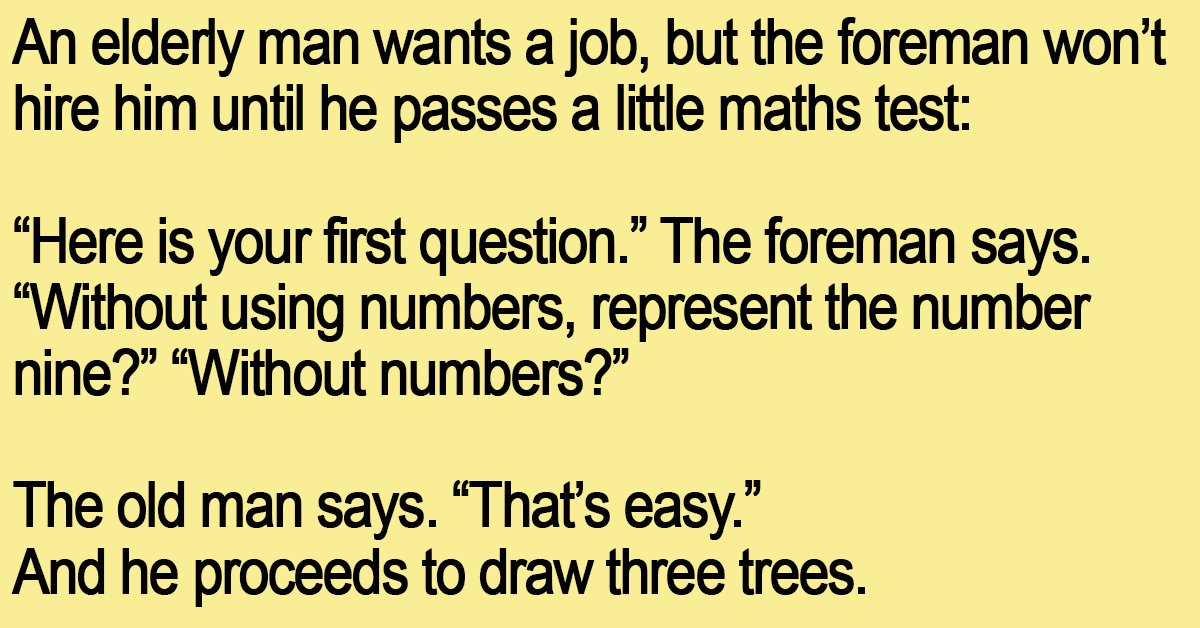 An elderly man wants a job, but the foreman won’t hire him until he passes a little maths test: