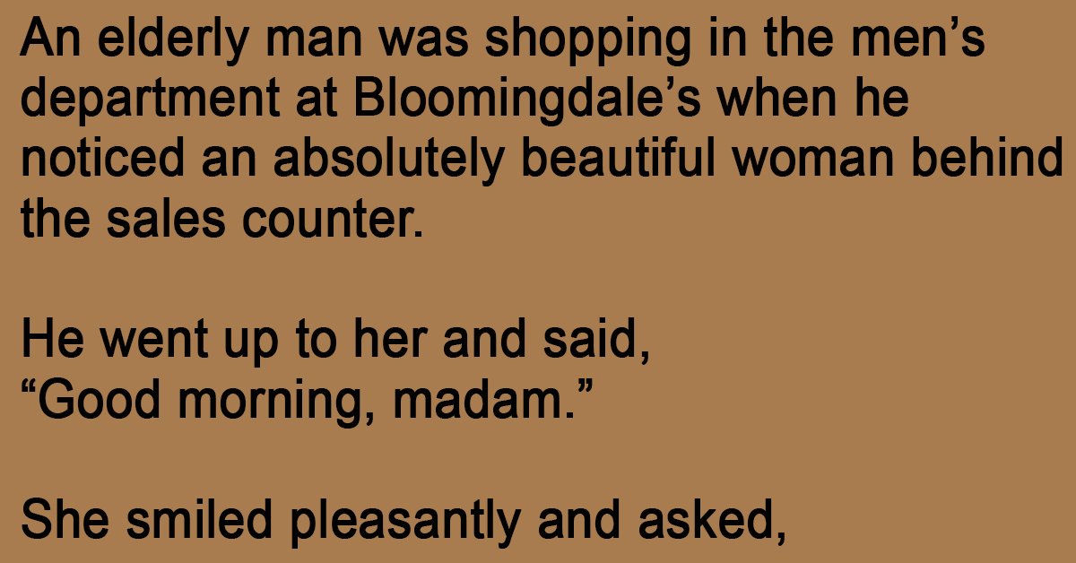 An elderly man was shopping in the men’s department at Bloomingdale’s when he noticed an absolutely beautiful woman behind the sales counter.