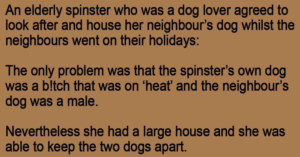 The only problem was that the spinster’s own dog was a b!tch that was on ‘heat’ and the neighbour’s dog was a male.