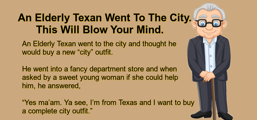 An Elderly Texan Went To The City. – April 1, 2022 by Kevin Adams Facebook Twitter Pinterest LinkedIn An Elderly Texan went to the city and thought he would buy a new “city” outfit. He went into a fancy department store and when asked by a sweet young woman if she could help him, he answered, “Yes ma’am. Ya see, I’m from Texas and I want to buy a complete city outfit.” Her eyes lit up as she asked, “Where would you like to start?” “Well, ma’am, how about a suit?” “Yes sir. What size?” “Size 53 tall, ma’am.” “Wow, that’s really big.” “Yes ma’am, they really grow them big in Texas.” “What’s next?” she asked. He replied, “How about some shoes?” “What size?” “Size 15 double E.” “Wow, that’s really big!” “Yes ma’am. They really grow them big in Texas.” “What’s next?” “Well, I reckon I’ll need a shirt.” “Yes sir. What size?” “Nineteen and a half neck sleeve 38,” he replied. “Wow, that’s really big! “ “Yes ma’am. They really grow them big in Texas.” “Will there be anything else?” she asked. “Yes ma’am. I ‘spect I’ll need a hat.” “Yes sir. What size? and style?” “Eight and five-eighths. Stetson.” “Wow, that’s really big!” “Yes ma’am. They really grow them big in Texas.” She virtually glowed as she asked, “Is there anything else I can do for you?” “No ma’am, I reckon that will be all.” As the sweet young thing tallied up his bill, and as the Texan counted out his money, she blushed and asked,? “Sir, could I ask you a question?” “Yes ma’am, I already know what it is. And the answer is four inches.” Astonished, she blurted out, “Why, my boyfriend is bigger than that!” Without so much as a stutter, the elderly Texan replied….. ‘From the floor ma’am……………..From the floor.’ Facebook Twitter Pinterest LinkedIn