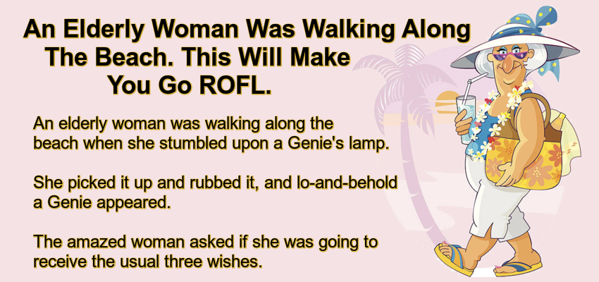 An elderly woman was walking along the beach when she stumbled upon a Genie’s lamp.