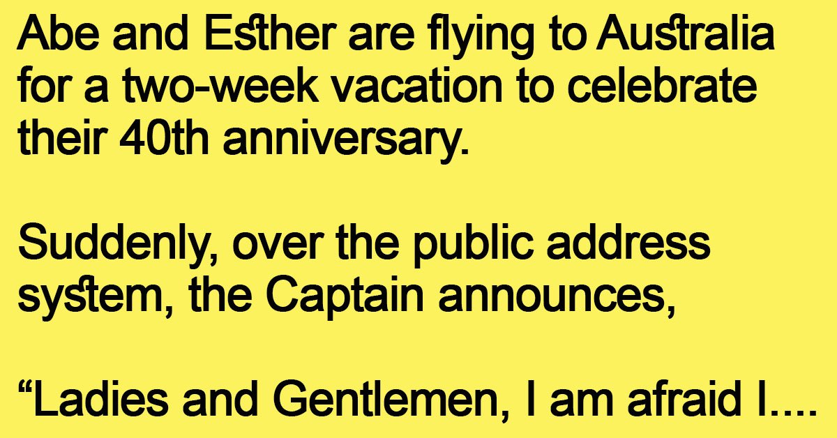 Abe and Esther are flying to Australia for a two-week vacation to celebrate their 40th anniversary.