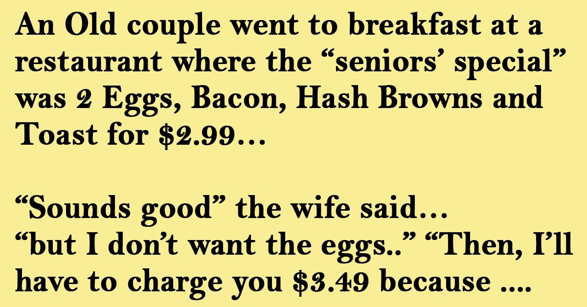 An Old couple went to breakfast at a restaurant where the “seniors’ special” was 2 Eggs, Bacon, Hash Browns and Toast for $2.99…