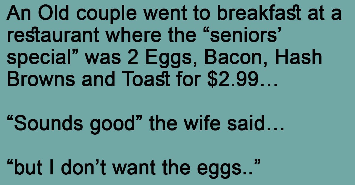 An Old couple went to breakfast at a restaurant where the “seniors’ special” was 2 Eggs, Bacon, Hash Browns and Toast for $2.99…