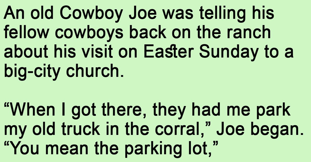 An old Cowboy Joe was telling his fellow cowboys back on the ranch about his visit on Easter Sunday to a big-city church.