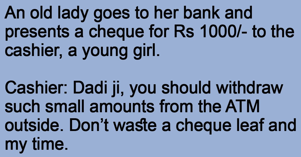Cashier: Dadi ji, you should withdraw such small amounts from the ATM outside. Don’t waste a cheque leaf and my time.