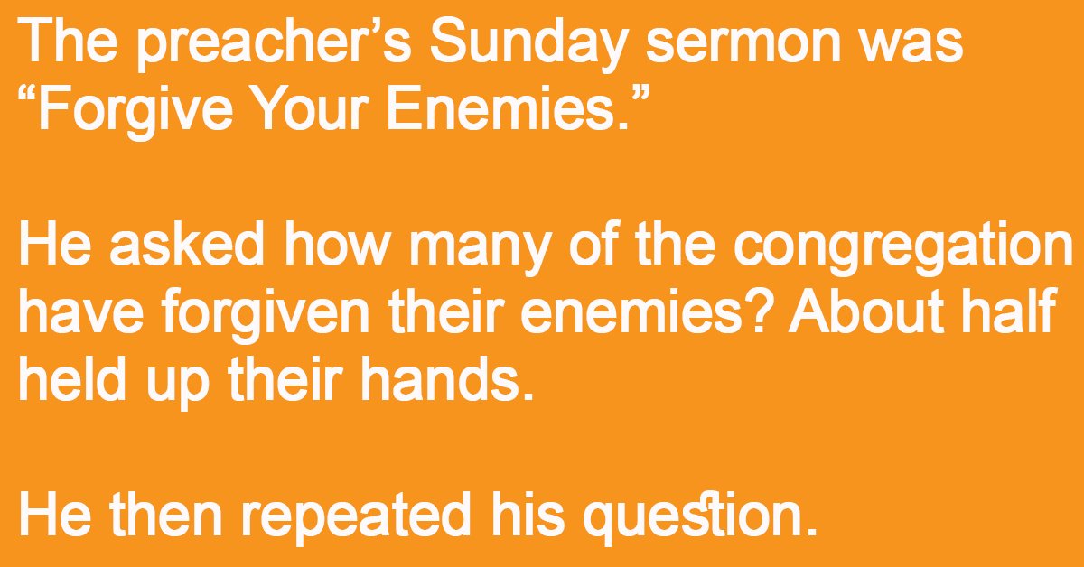 The preacher’s Sunday sermon was “Forgive Your Enemies.”