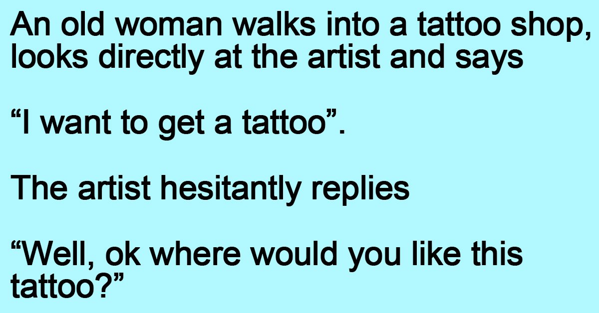 An old woman walks into a tattoo shop, looks directly at the artist and says