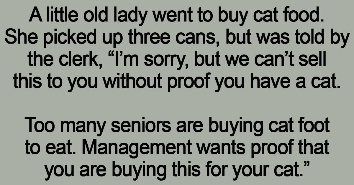 “I’m sorry, but we can’t sell this to you without proof you have a cat. Too many seniors are buying cat foot to eat. Management wants proof that you are buying this for your cat.”