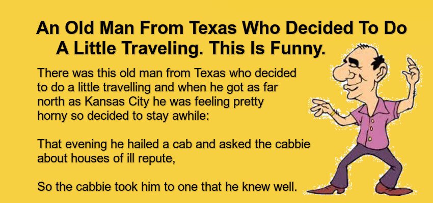 There was this old man from Texas who decided to do a little travelling and when he got as far north as Kansas City he was feeling pretty horny so decided to stay awhile: