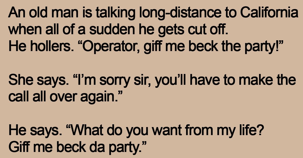 He says. “Operator, ya know vat? Take da telephone and shove it in you-know-vere!” And he hangs up.