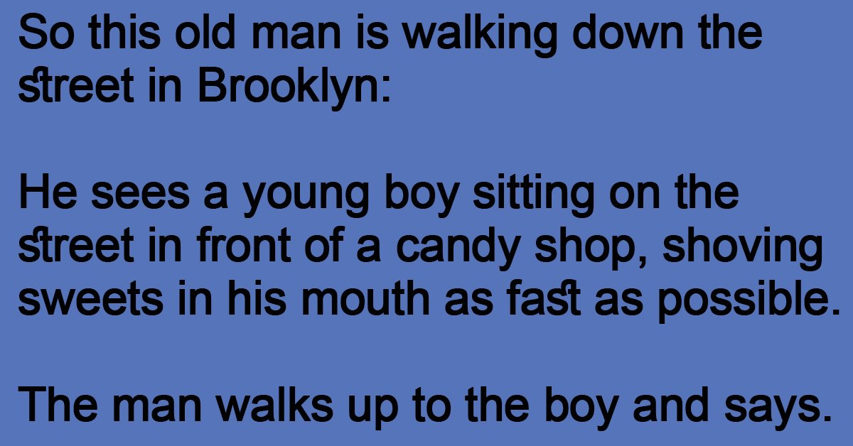 He sees a young boy sitting on the street in front of a candy shop, shoving sweets in his mouth as fast as possible.