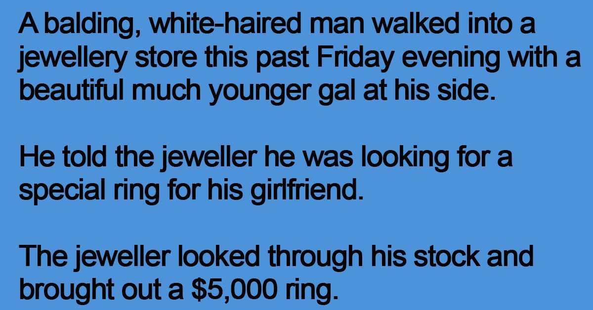 A balding, white-haired man walked into a jewellery store this past Friday evening with a beautiful much younger gal at his side.