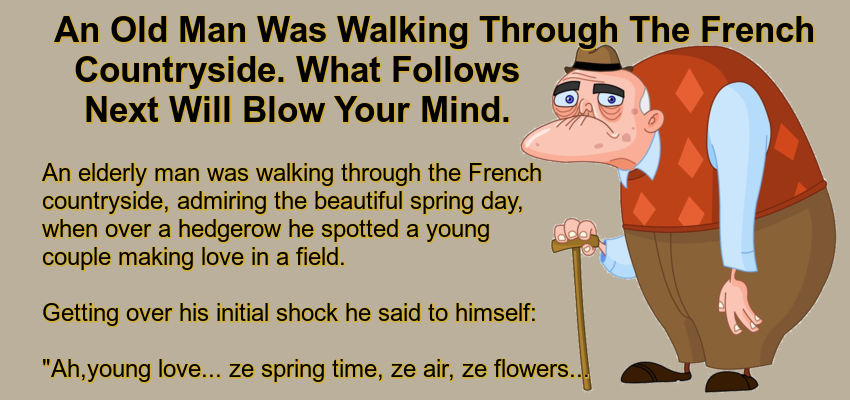 An elderly man was walking through the French countryside, admiring the beautiful spring day, when over a hedgerow he spotted a young couple making love in a field.