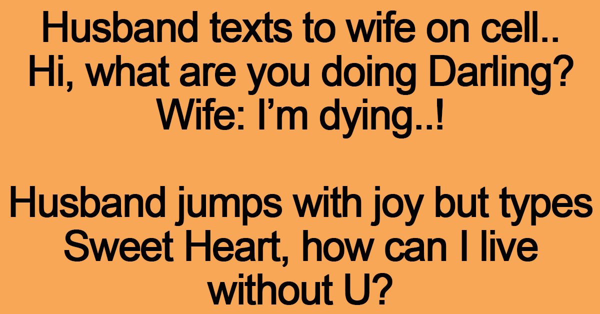 Husband texts to wife on cell.. Hi, what are you doing Darling? Wife: I’m dying..! Husband jumps with joy but types Sweet Heart, how can I live without U? Wife: … …